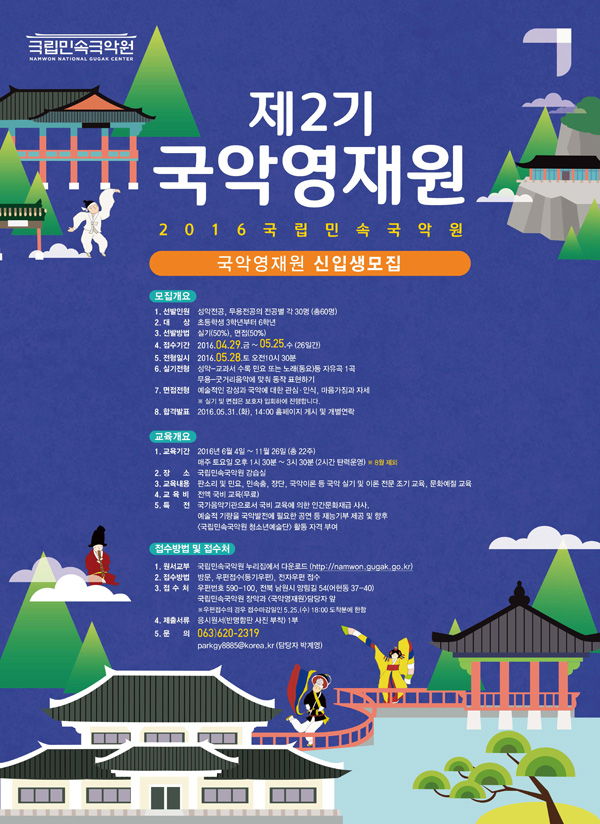 ¡°Á¦2±â ±¹¾Ç¿µÀç¿ø¡± ÀÔÇÐÀ» Èñ¸ÁÇÏ´Â Èñ¸ÁÀÚ ¼·ùÁ¢¼ö´Â ¿À´Â 5¿ù 25ÀϱîÁöÀ̸ç, ÀÀ½Ã¿ø¼¸¦ ÀÛ¼ºÇØ ¹æ¹®Á¢¼ö ¶Ç´Â ¿ìÆíÁ¢¼ö, ÀüÀÚ¸ÞÀÏÀ» ÅëÇØ ±¹¸³¹Î¼Ó±¹¾Ç¿ø Àå¾Ç°ú¿¡ Á¦ÃâÇÏ¸é µÈ´Ù. ÀÚ¼¼ÇÑ »çÇ×Àº ±¹¸³¹Î¼Ó±¹¾Ç¿ø ´©¸®Áý(http://namwon.gugak.go.kr)¸¦ Âü°í.