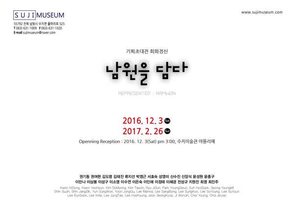 2016³â 12¿ù 2ÀϺÎÅÍ 2017³â 2¿ù 26ÀϱîÁö ÁøÇàµÇ´Â ¿ÃÇØ ¸¶Áö¸· ±âȹÀü½ÃÀÎ ¡®³²¿øÀ» ´ã´Ù REPRESENTED : NAMWON¡¯´Â Çö´ë Çѱ¹ ȸÈÀÇ ½Ã´ëÁ¤½ÅÀ» ¹Ý¿µÇϴ ȸÈÁ¤½Å(ȸÀå ½ÅÀå½Ä) ÀÛ°¡µéÀÇ ±âȹÃÊ´ëÀüÀ¸·Î Çѱ¹ ÄÁÅÛÆ÷·¯¸® ¾ÆÆ®ÀÇ Çö ÁÖ¼Ò¸¦ ¾Ë¾Æº¼ ¼ö ÀÖ´Â ÀÛǰµéÀ» Àü½ÃÇÑ´Ù.